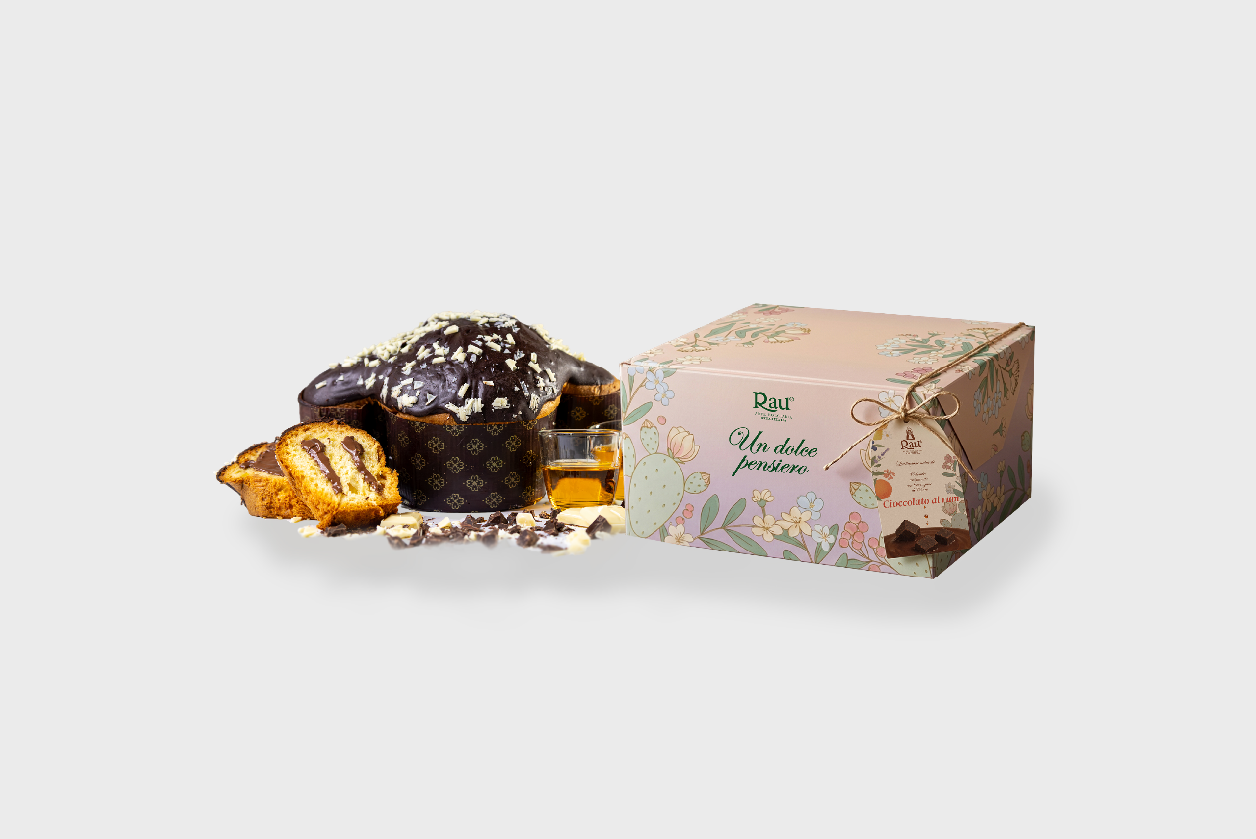 Prodotto dolciario da forno a lievitazione naturale senza uvetta e senza canditi in pezzi, glassato e farcito con crema al cioccolato al rum.